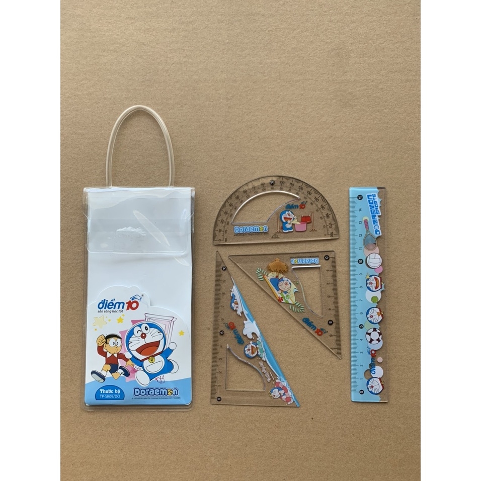 Bộ Thước Kẻ Doraemon Điểm 10 TP-SR09/DO MÔ TẢ SẢN PHẨM- Thương hiệu: Điểm 10- Kích thước: 1 thước thẳng 15 cm, 1 thước eke 45, 1 thước eke 60, 1 thước đo góc 180.- Quy cách: 1 bộ / 4 cây / túi- Màu sắc: Trong suốt- Độ trong suốt: CaoThước thẳng được chế tạo từ nhựa dẻo có độ bền cao. Được sử dụng nhiều trong học tập, cơ khí, vẽ các bảng kĩ thuật, xây dựng, vẽ tranh..., dùng để đo dộ dài và kích thước của một vật. Trên thước có vạch, các vạch cách nhau 1 mm, để đo dộ dài chi tiết hơn.- Phiên bản sử dụng hình ảnh Doraemon dễ thương và vô cùng tinh nghịch- Chất liệu bằng nhựa cứng, thân trong, in vạch số chính xác và sắc nét.- Cạnh thước được bo tròn không đau tay, an toàn khi sử dụng.Tính năng nổi bật:- Thước SR-09/DO là thước bẳng nhựa trong thích hợp cho học sinh.- Bao bì dạng túi PVC bên trong có 4 cây. Hình ảnh Doraemon sinh động. In ấn trên thước và trên bao bì phù hợp với nhiều đối tượng sử dụng.- Công dụng: Dùng để kẻ đường thẳng và đo góc.#thuoceke #bothuocekethienlong #thuocekehongha #boeke #bothuoceke #thuocdiem10
