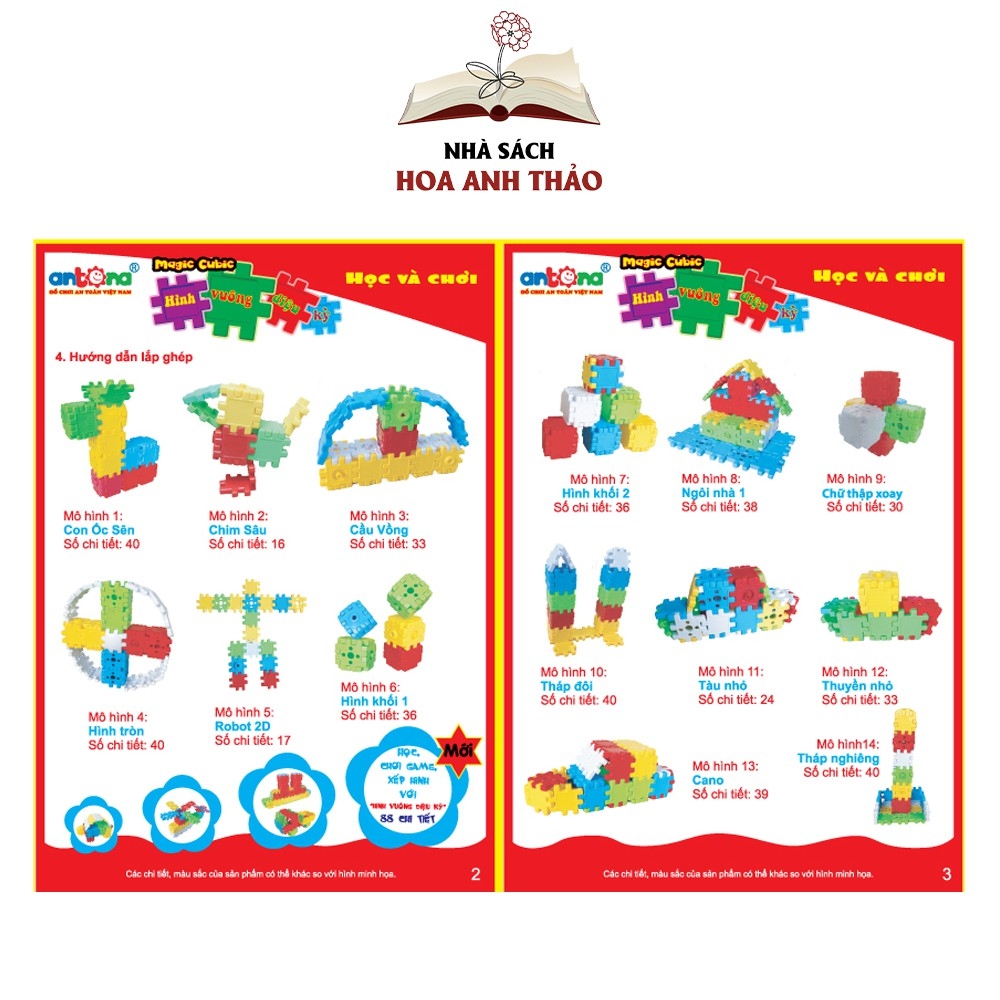 ĐỒ CHƠI ANTONA BỘ LẮP GHÉP HÌNH VUÔNG DIỆU KỲ 40 CHI TIẾT 📜 THÔNG TIN CHI TIẾT Đồ chơi Antona bộ lắp ghép hình vuông diệu kỳ 40 chi tiết ☘ Chất liệu: Nhựa nguyên sinh, an toàn tuyệt đối cho bé ☘ Thương hiệu: Antona ☘ Xuất xứ: Việt Nam ☘ Màu sắc: Nhiều màu khác nhau ☘ Kích thước mỗi hình ghép: 5.2 x 5.2 cmĐỒ CHƠI ANTONA BỘ LẮP GHÉP HÌNH VUÔNG DIỆU KỲ 40 CHI TIẾT ❖ Bộ đồ chơi Hình vuông diệu kỳ - Bộ 40 chi tiết được làm từ các miếng ghép hình vuông diệu kỳ to bao gồm 40 chi tiết với nhiều loại miếng ghép và màu sắc đa dạng khác nhau. Bé sẽ bắt đầu bằng việc bỏ các miếng ghép ra bên ngoài túi và bắt đầu lắp ghép các mô hình theo mẫu. Bé sẽ phải phối hợp giữa tay và mắt, để lắp đúng được các mô hình trong hướng dẫn. Sau khi chơi quen với các miếng ghép và các mô hình được hướng dẫn lắp ghép, bé có thể sáng tạo thêm được rất nhiều mô hình thú vị khác.❖ Bộ lắp ghép Hình vuông diệu kỳ - Bộ 40 chi tiết được làm từ 100% nhựa nguyên sinh, đảm bảo tuyệt đối an toàn cho bé khi vui chơi. Bé có thể thoả thích chơi đùa, vừa có thể học hỏi thêm kiến thức mà vẫn an toàn cho sức khỏe của bé.❖ Các cạnh của bộ lắp ghép đều được vê tròn, đảm bảo an toàn khi sử dụng ❖ Trong quá trình chơi với bộ lắp ghép Hình vuông diệu kỳ - Bộ 40 chi tiết, bé sẽ học hỏi thêm được nhiều kỹ năng và kiến thức cần thiết cho cuộc sống: Bé học lắp ghép, phát triển tư duy logic, phát triển trí thông minh và óc sáng tạo, rèn luyện sự tập trung và tính kiên trì ❖ Sản phẩm có hướng dẫn sử dụng rất cụ thể và chi tiết được đính kèm.NHÀ SÁCH HOA ANH THẢO CAM KẾT1. 100% Sách mới, Chuẩn nhà xuất bản 2. Sản phẩm được kiểm tra kỹ, đóng gói cẩn thận trước khi giao đến quý khách 3. Giao hàng trên toàn quốc4. Hỗ trợ đổi trả theo quy định của Shopee. ∎ Điều kiện áp dụng (trong vòng 07 ngày kể từ khi nhận sản phẩm) - Hàng hoá vẫn còn mới, chưa qua sử dụng - Hàng hoá bị lỗi hoặc hư hỏng do vận chuyển hoặc do nhà sản xuất ∎ Trường hợp được chấp nhận: - Hàng giao không đúng như đơn quý khách đặt hàng - Không đủ số lượng, không đủ bộ như trong đơn hàng ∎ Trường hợp không đủ điều kiện áp dụng chính sách: - Quá 07 ngày kể từ khi Quý khách nhận hàng- Gửi lại hàng không đúng mẫu mã, không phải sản phẩm của Nhà sách Hoa Anh Thảo - Không thích, không hợp, đặt nhầm mã, ...#dochoi #sach #hoaanhthao #lapghep #hinhkhoi #dieuky #antoan #nhua #mausac #hinhkhoi #toanhoc #nguyensinh #nhasach #nhasachonline #giaoduc #phatrien #tuduy #sangtao #ngonngu #kynangsong