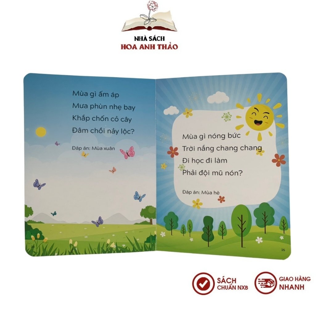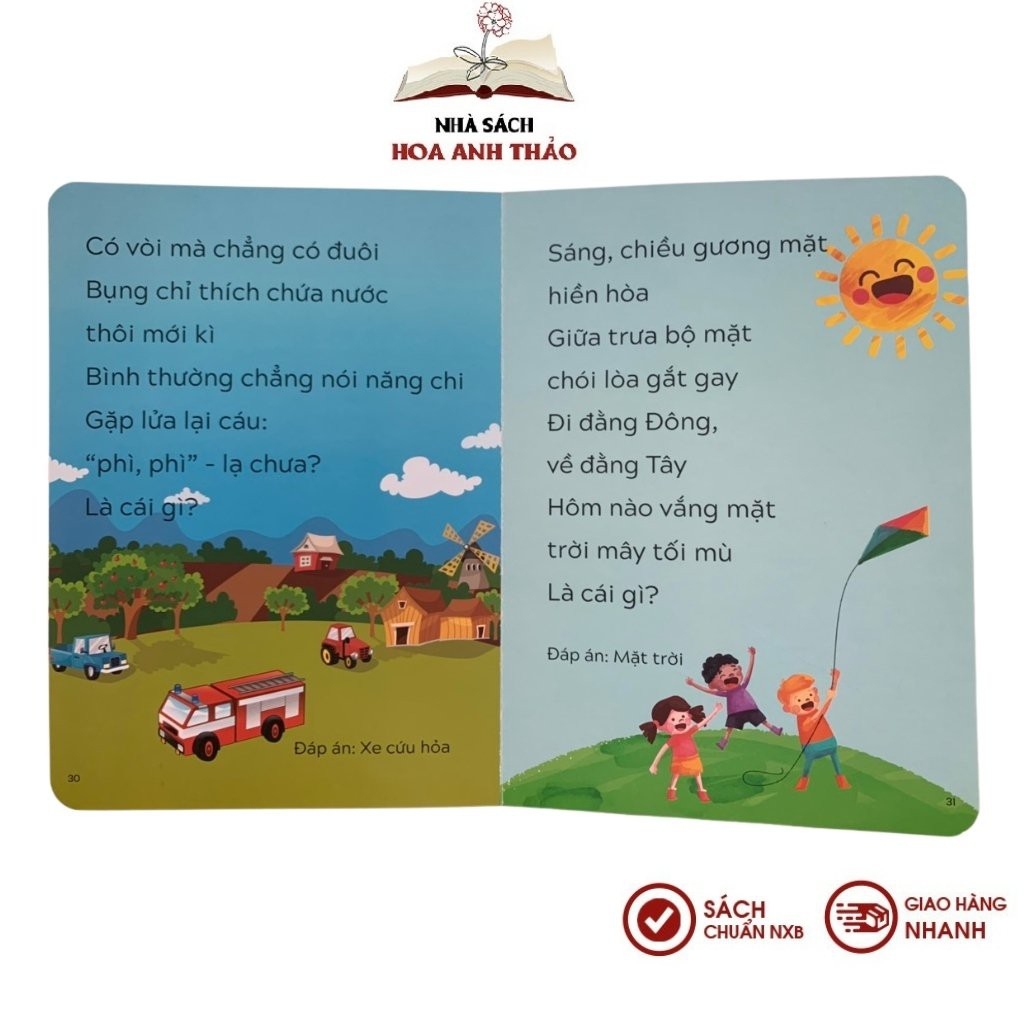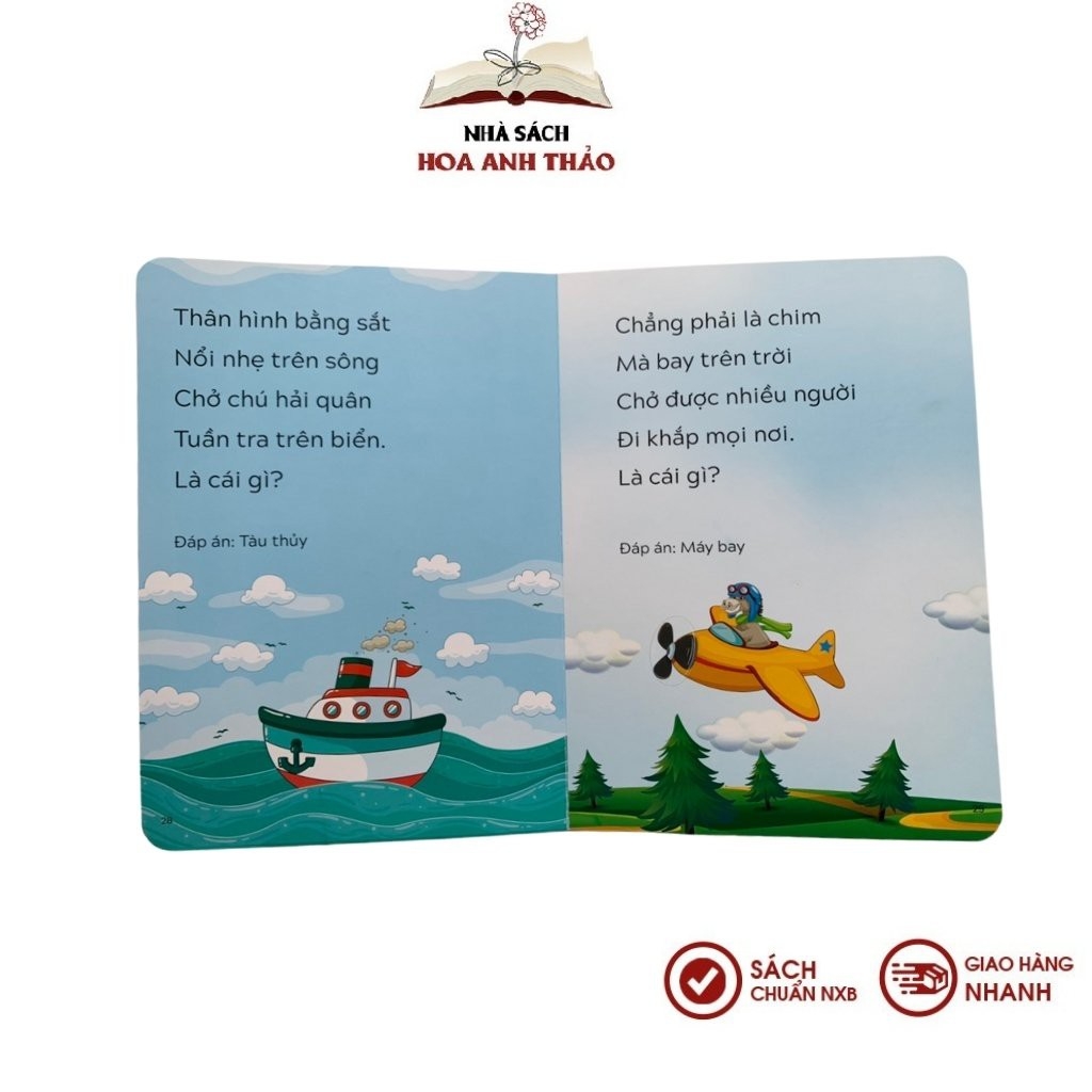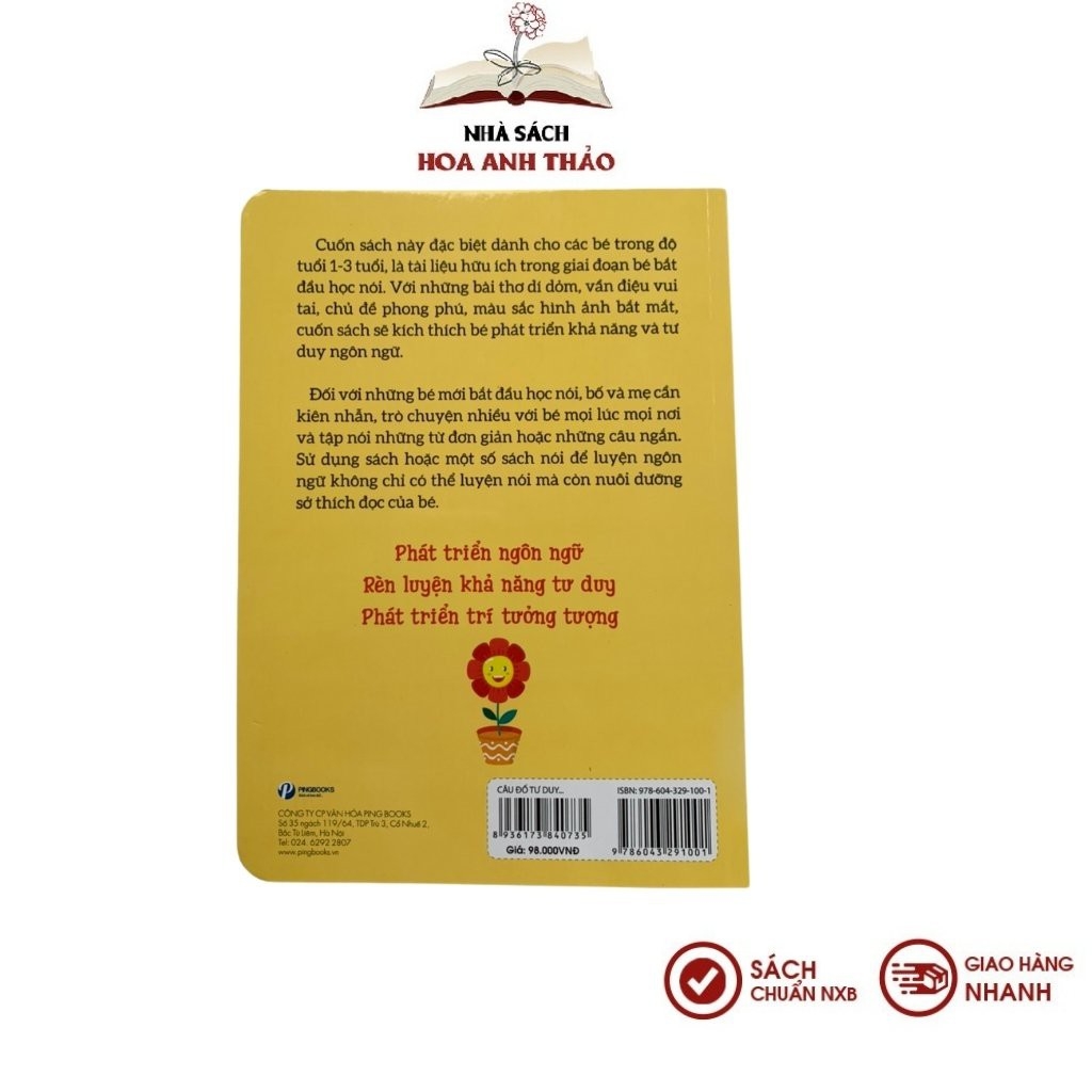 SÁCH - CÂU ĐỐ TƯ DUY CHO TRẺ TẬP NÓI - TẬP ĐỌC📜 THÔNG TIN CHI TIẾT Sách - Câu Đố Tư Duy cho Trẻ Tập Nói - Tập Đọc☘ Tác giả: Pingbooks☘ Nhà xuất bản: Phụ nữ Việt Nam☘ Nhà phát hành: Pingbooks☘ Năm xuất bản: 2021☘ Số trang: 34 trang☘ Chất liệu giấy: Bìa cứng☘ Kích thước: 17 x 23.5 cm☘ Độ tuổi: 1-3 tuổi 📖 GIỚI THIỆU SÁCH - CÂU ĐỐ TƯ DUY CHO TRẺ TẬP NÓI - TẬP ĐỌC- Sách tổng hợp những bài thơ dí dỏm, vần điệu vui tai, chủ đề phong phú dạy bé nhận biết về các con vật, loài cây, hiện tượng tự nhiên, bốnmùa…- Đây là cách giúp bé tập nói – tập đọc rất hiệu quả, tăng khả năng tư duy, ngôn ngữ.- Sách bao gồm những bài thơ câu đố ngắn có vần điệu vui nhộn sẽ cung cấp cho trẻ những kiến thức sơ đẳng về đặc điểm của các con vật, cây cối, những sự vật hiện tượng thiên nhiên… giúp bé dễ dàng ghi nhớ, phát triển hoạt động nhận biết, phát triển trí não, nhanh biết nói hơn.NHÀ SÁCH HOA ANH THẢO CAM KẾT1. 100% Sách mới, Chuẩn nhà xuất bản 2. Sản phẩm được kiểm tra kỹ, đóng gói cẩn thận trước khi giao đến quý khách 3. Giao hàng trên toàn quốc4. Hỗ trợ đổi trả theo quy định của Shopee. ∎ Điều kiện áp dụng (trong vòng 07 ngày kể từ khi nhận sản phẩm) - Hàng hoá vẫn còn mới, chưa qua sử dụng - Hàng hoá bị lỗi hoặc hư hỏng do vận chuyển hoặc do nhà sản xuất ∎ Trường hợp được chấp nhận: - Hàng giao không đúng như đơn quý khách đặt hàng - Không đủ số lượng, không đủ bộ như trong đơn hàng ∎ Trường hợp không đủ điều kiện áp dụng chính sách: - Quá 07 ngày kể từ khi Quý khách nhận hàng- Gửi lại hàng không đúng mẫu mã, không phải sản phẩm của Nhà sách Hoa Anh Thảo - Không thích, không hợp, đặt nhầm mã, ...#sach #hoaanhthao #quyen #truyen #tranh #truyentranh #eq #iq #IQ #daytre #tuduy #caudochobe #caudochotre #caudotuduychotre #caudotuduychobe #sachchotretapnoi #tapdoc #tapnoi