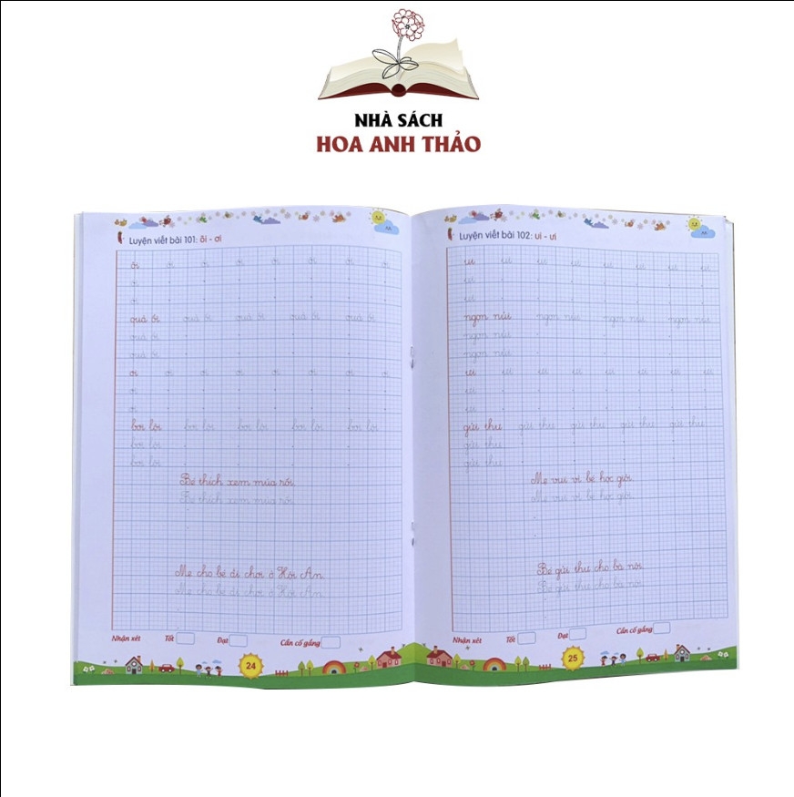 ❖ Vở tập viết in màu trên chất liệu giấy trắng dày định lượng 100g chống lóa, chống thấm mực. Bìa cán bóng.